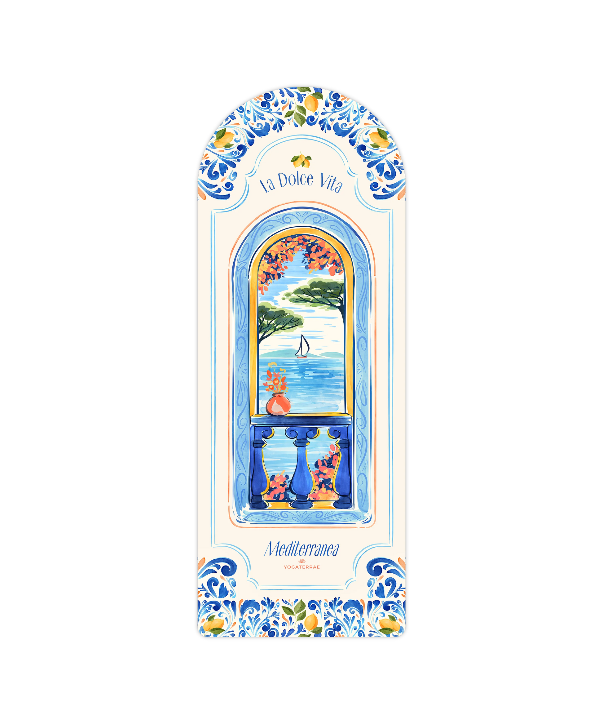 La composition, inspirée des faïences du sud de l’Italie, mêle les bleus profonds de la Méditerranée à des teintes solaires et vibrantes. Le choix de l’arche n’est pas anodin : il évoque les portes anciennes, les seuils symboliques, les passages de l’agitation vers la quiétude. C’est un appel à ralentir, à s’ancrer, à pratiquer avec douceur.
