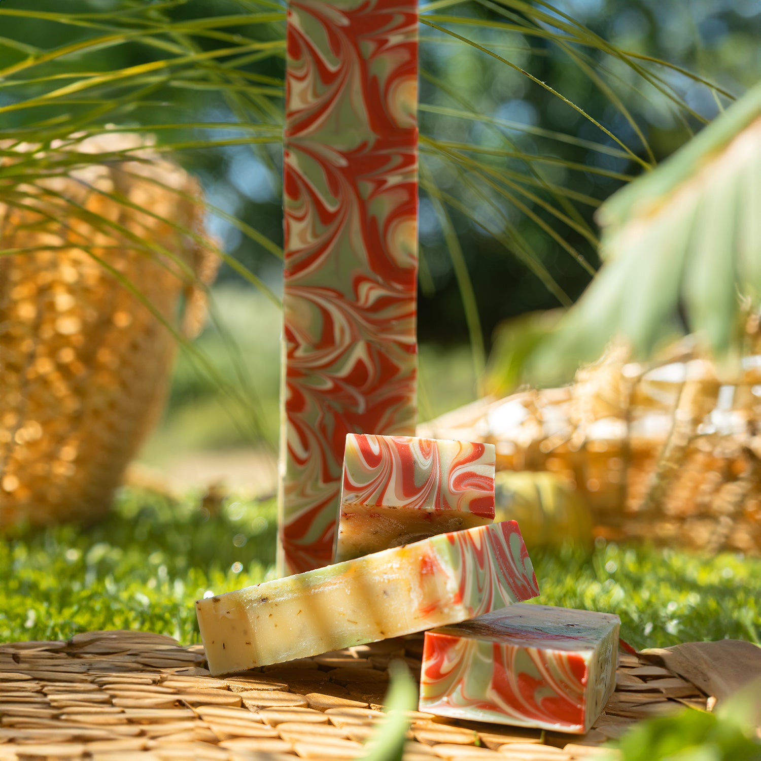 Chaque barre de savon est un jardin luxuriant de bien-être et d'harmonie, cultivé avec des ingrédients naturels et bio tels que des tomates fraîches et des feuilles de basilic.