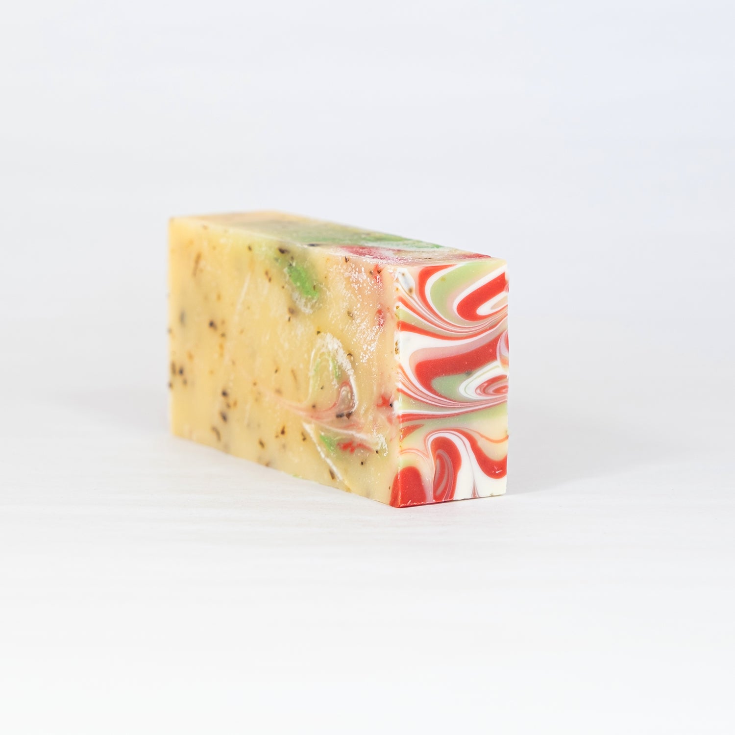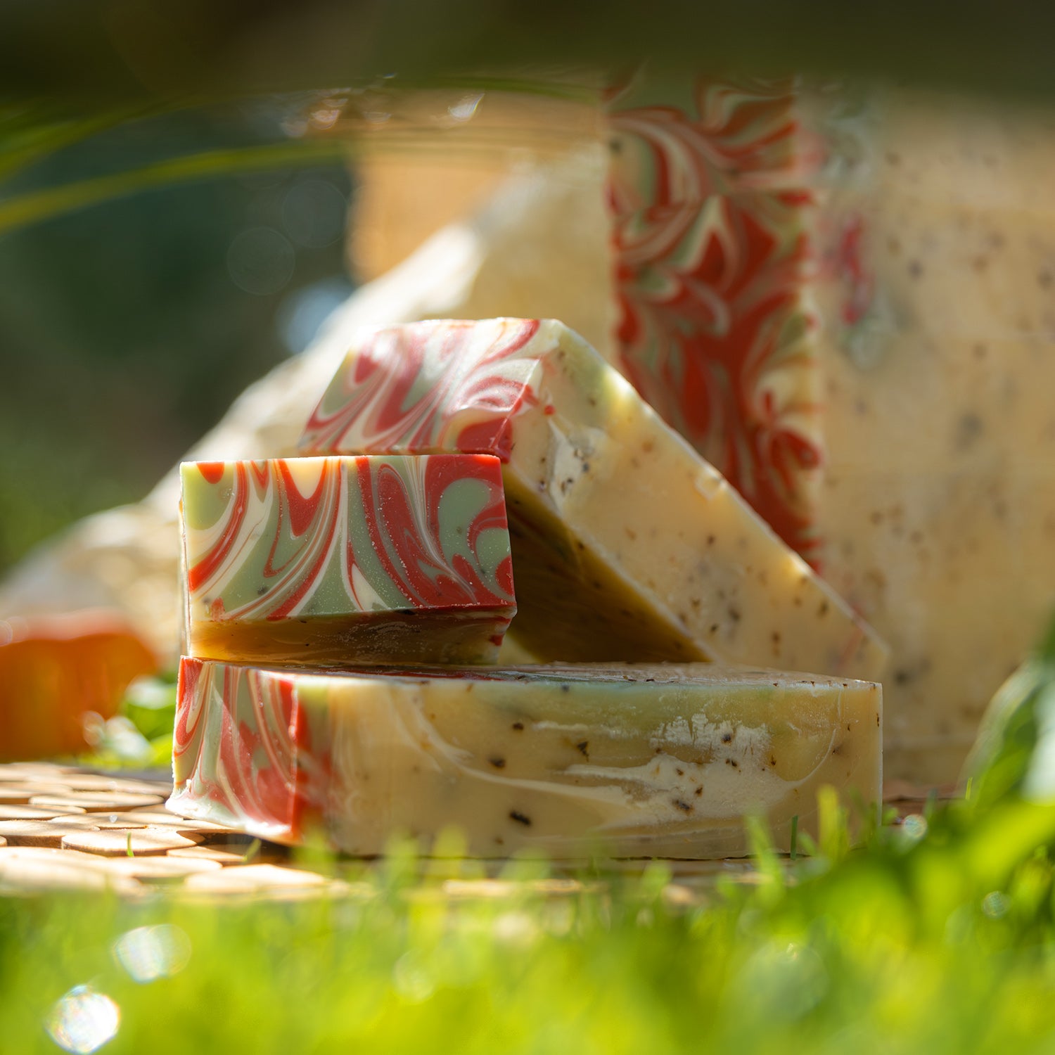 Chaque barre de savon est un jardin luxuriant de bien-être et d'harmonie, cultivé avec des ingrédients naturels et bio tels que des tomates fraîches et des feuilles de basilic.