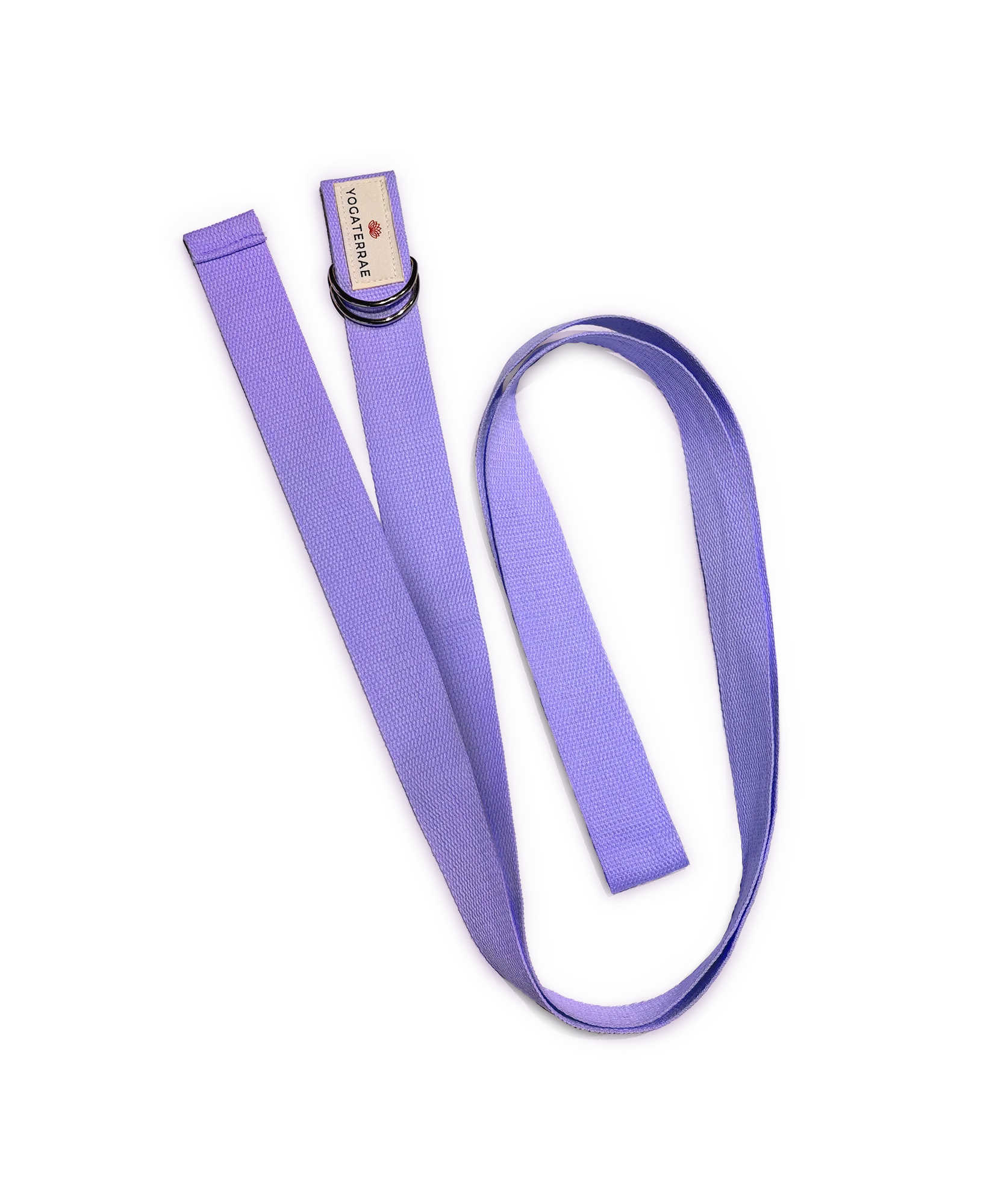 Sangle de yoga lavandin avec boucle inox, pensée pour étirer en douceur, apaiser le corps et accompagner votre tapis de yoga dans une pratique calme et précise.