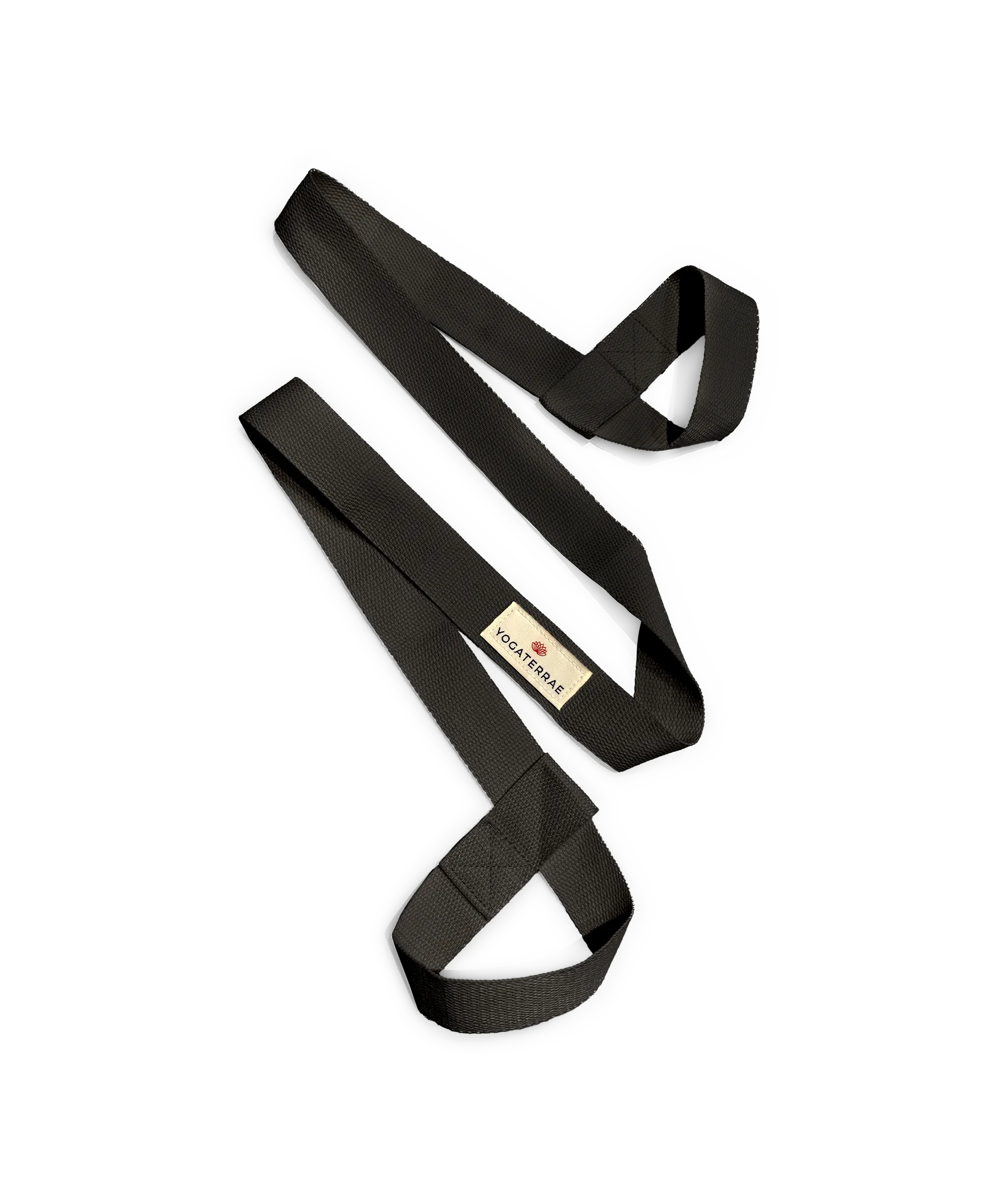 Sangle de yoga noire avec étiquette tissée, sobre et pratique, parfaite pour accompagner les étirements et porter votre tapis de yoga avec style.