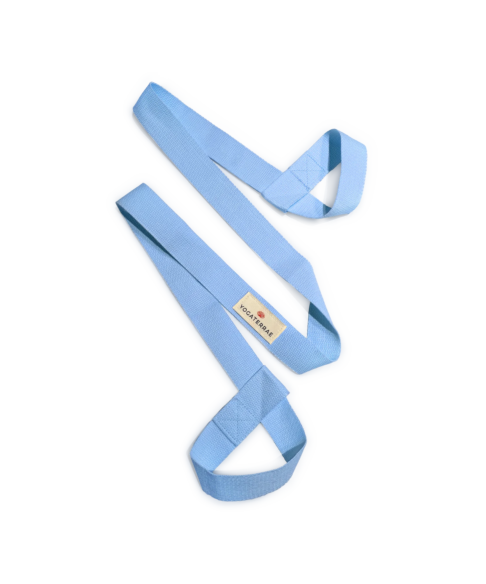 Sangle de yoga bleu ciel légère et fluide, conçue pour étirer en douceur et transporter votre tapis de yoga avec légèreté.